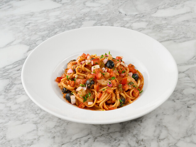 Juicy prawns with linguine in a tomato, olive and caper seafood sauce. Finished with fresh tomato, red onion and parsley