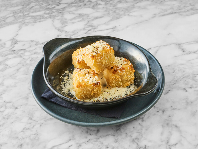Golden, crispy pasta bites filled with a luscious blend of Pecorino cheese, black pepper and indulgent truffle on a blue cheese sauce