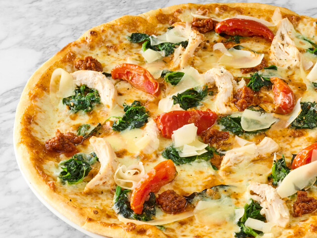 Love at first slice. A creamy béchamel, basil and sun-dried tomato & pine kernel pesto sauce, topped with chicken, spinach, mozzarella, and finished with even more pesto, slow-roasted tomatoes and Gran Milano cheese