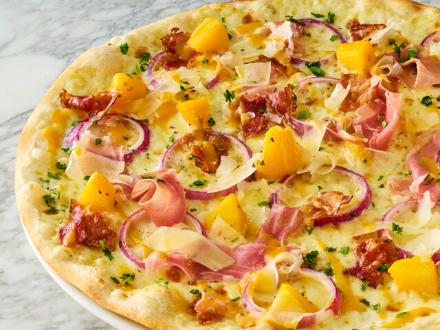 Just peachy! Peach, red onion and mozzarella on a béchamel base. Topped with crispy pancetta and Parma Ham D.O.P, Gran Milano cheese and parsley. Served with Sauce Shop® Peach Habanero Hot Sauce